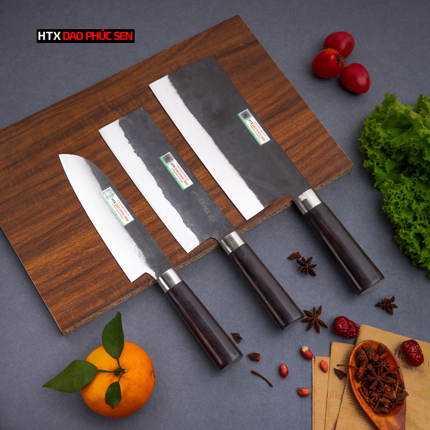 - Bộ dao bếp nhíp xe chặt thái lọc đa năng cán gỗ mun CB89NM được thợ rèn giỏi của HTX DAO PHÚC SEN rèn thủ công, đảm bảo tỉ mỉ đến từng chi tiết. Dao đạt được độ sắc bén cao.