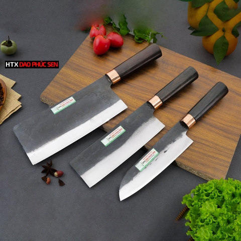 - Bộ dao bếp nhíp xe chặt thái lọc đa năng cán gỗ mun CB89NMDD được thợ rèn giỏi của HTX DAO PHÚC SEN rèn thủ công, đảm bảo tỉ mỉ đến từng chi tiết. Dao đạt được độ sắc bén cao.
