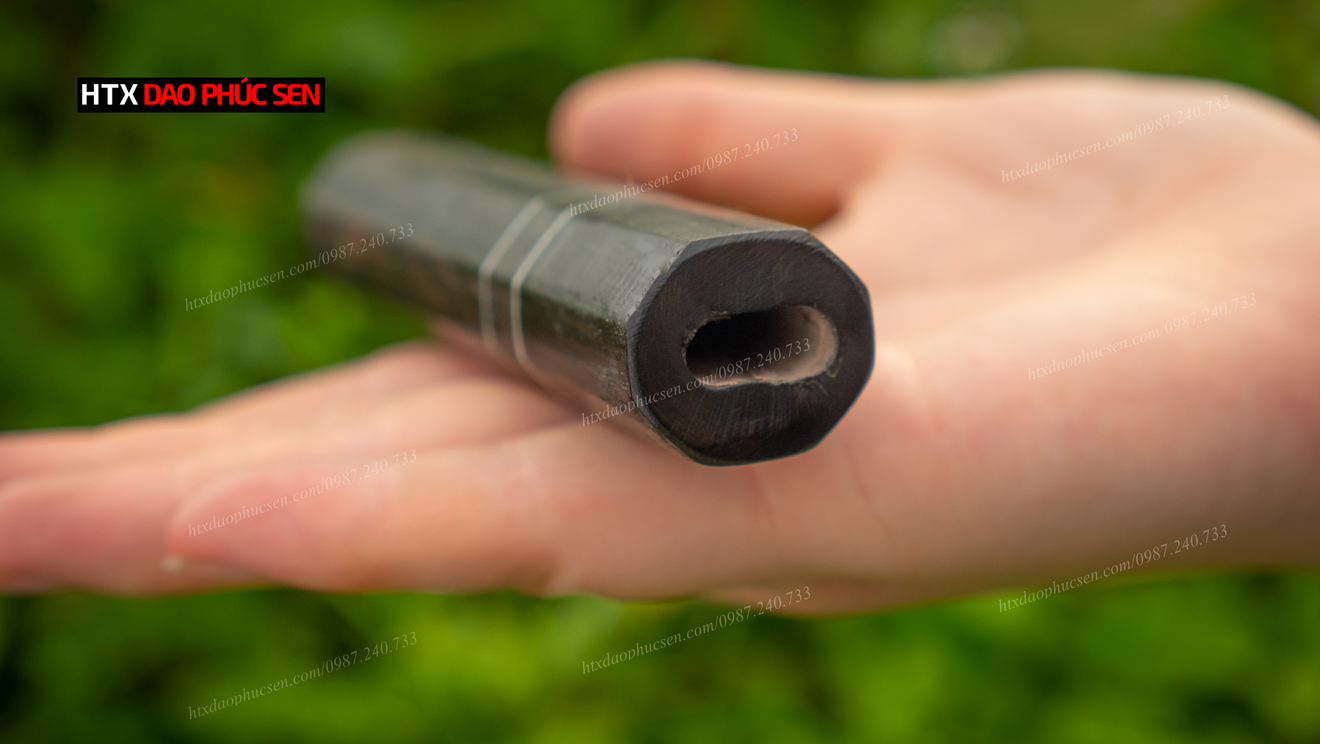 Cán dao Nhật bát giác gỗ mun - CN02 được làm từ chất liệu gỗ MUN được làm từ gỗ mun là loại gỗ thường được sử dụng trong sản xuất đồ mỹ nghệ. Bên cạnh tính thẩm mỹ thì độ bền của gỗ mun là yếu tố hàng đầu để HTX Dao Phúc Sen lựa chọn là nguyên liệu làm cán dao. Do đặc thù dao bếp khi sử dụng phải thường xuyên tiếp xúc nước nên với ưu điểm không mục, không mủn khi gặp nước như các loại gỗ thông thường, cộng với sự tỉ mỉ, cẩn thận của thợ trong công đoạn tra cán đảm bảo độ bền và an toàn tuyệt đối cho người sử dụng.