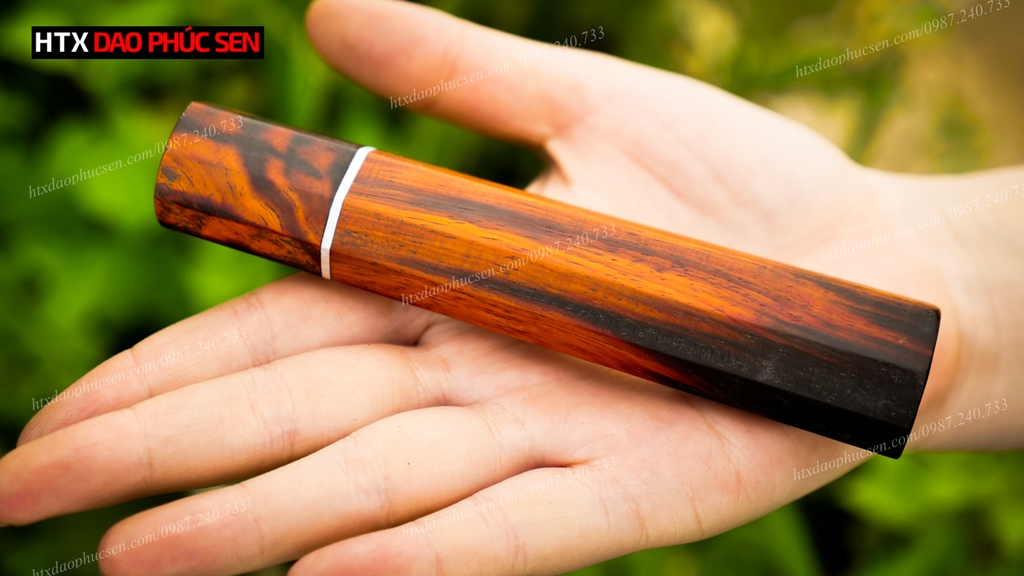 Cán dao Nhật bát giác gỗ trắc - CN09 được làm từ chất liệu gỗ TRẮC được làm từ gỗ mun là loại gỗ thường được sử dụng trong sản xuất đồ mỹ nghệ. Bên cạnh tính thẩm mỹ thì độ bền của gỗ TRẮC là yếu tố hàng đầu để HTX Dao Phúc Sen lựa chọn là nguyên liệu làm cán dao. Do đặc thù dao bếp khi sử dụng phải thường xuyên tiếp xúc nước nên với ưu điểm không mục, không mủn khi gặp nước như các loại gỗ thông thường, cộng với sự tỉ mỉ, cẩn thận của thợ trong công đoạn tra cán nên đảm bảo độ bền và an toàn tuyệt đối cho người sử dụng.