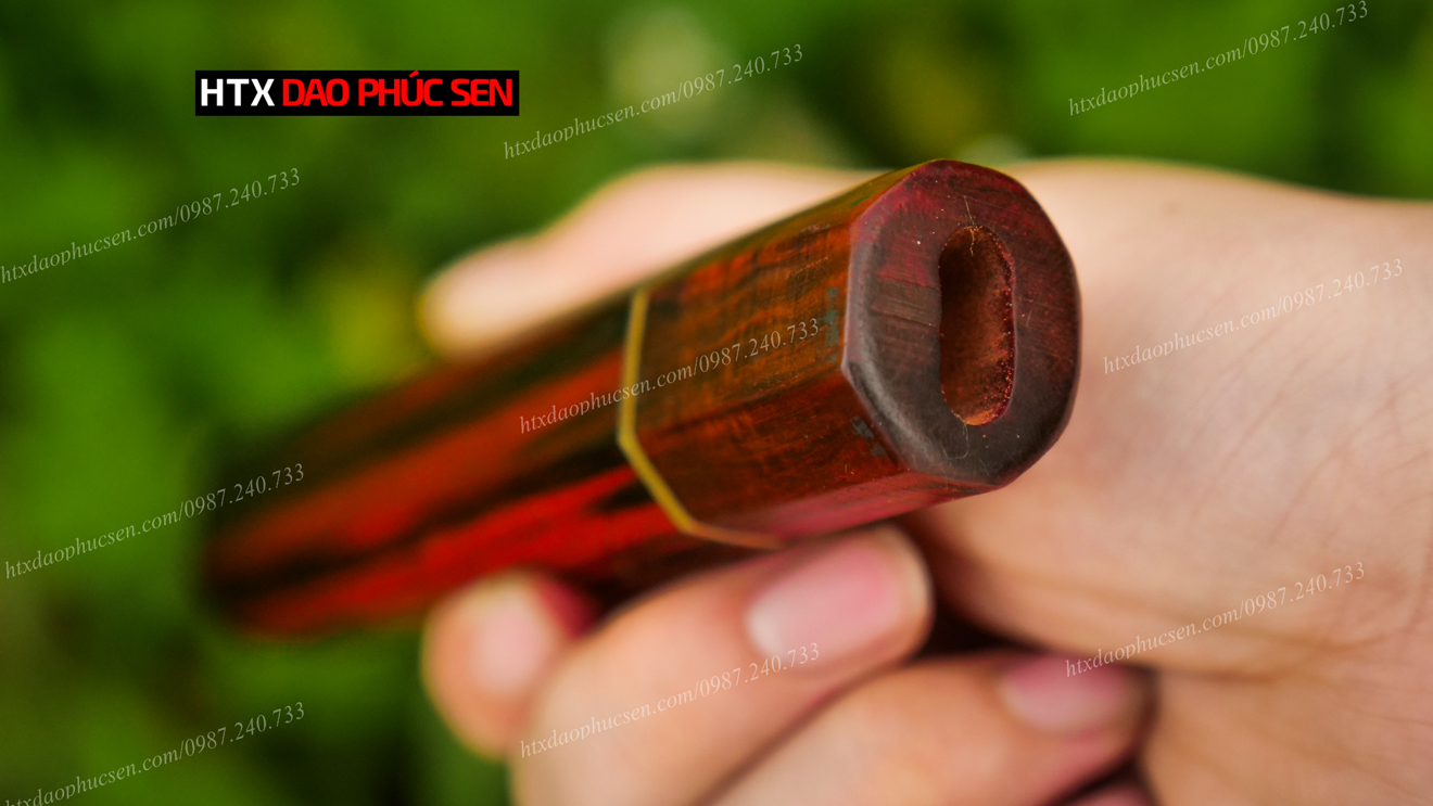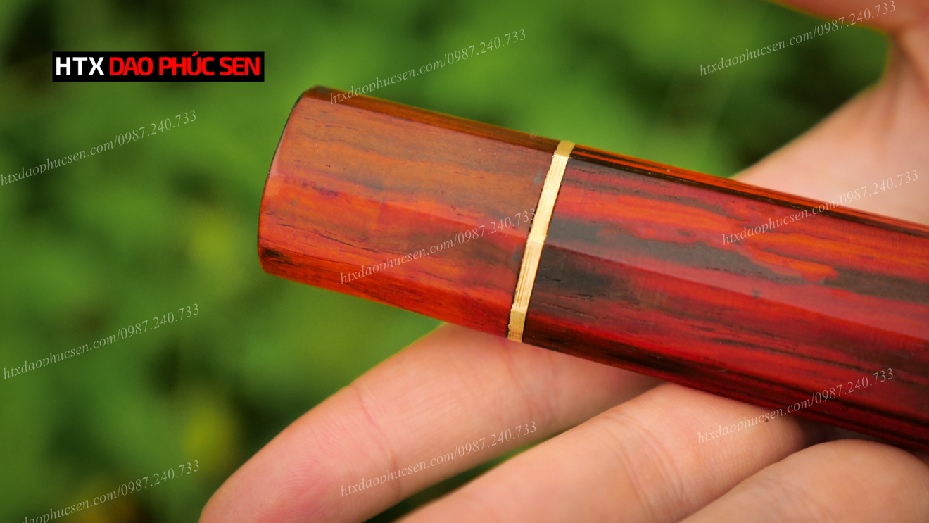 Cán dao Nhật bát giác gỗ trắc - CN10 được làm từ chất liệu gỗ TRẮC được làm từ gỗ mun là loại gỗ thường được sử dụng trong sản xuất đồ mỹ nghệ. Bên cạnh tính thẩm mỹ thì độ bền của gỗ TRẮC là yếu tố hàng đầu để HTX Dao Phúc Sen lựa chọn là nguyên liệu làm cán dao. Do đặc thù dao bếp khi sử dụng phải thường xuyên tiếp xúc nước nên với ưu điểm không mục, không mủn khi gặp nước như các loại gỗ thông thường, cộng với sự tỉ mỉ, cẩn thận của thợ trong công đoạn tra cán nên đảm bảo độ bền và an toàn tuyệt đối cho người sử dụng.