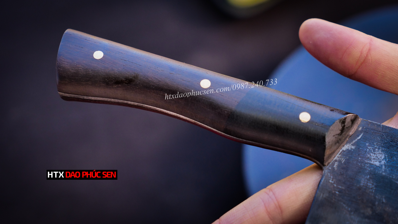 Phần cán Dao thái lọc G09A được làm từ gỗ mun - cẩm kết hợp với nhau đẹp mắt. là loại gỗ thường được sử dụng trong sản xuất đồ mỹ nghệ. Bên cạnh tính thẩm mỹ thì độ dai bền của gỗ là yếu tố hàng đầu để HTX Dao Phúc Sen lựa chọn là nguyên liệu làm cán dao. Do đặc thù dao bếp khi sử dụng phải thường xuyên tiếp xúc nước nên với ưu điểm không mục, không mủn khi gặp nước như các loại gỗ thông thường, cộng với sự tỉ mỉ, cẩn thận của thợ trong công đoạn tra cán nên dao cán gỗ mun - cẩm đảm bảo độ bền và an toàn tuyệt đối cho người sử dụng.