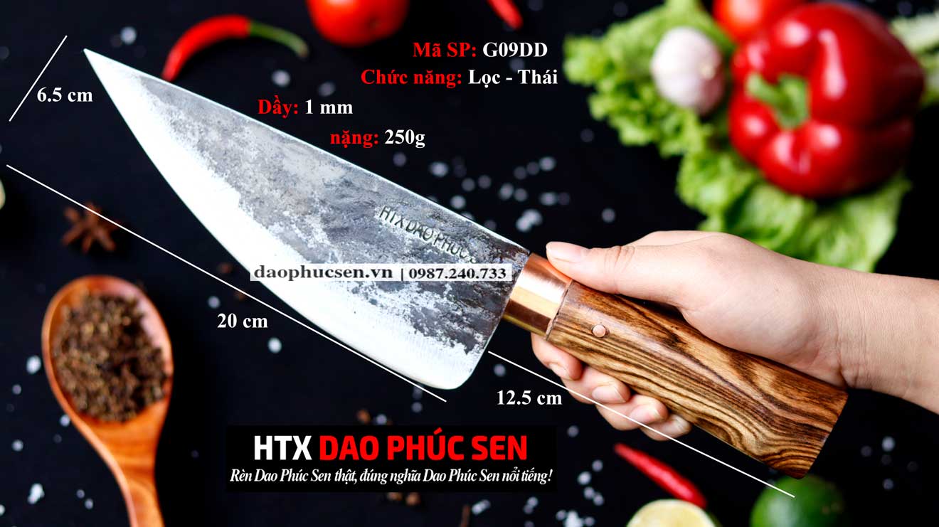 Dao bầu lọc thái G09DD là một sản phẩm của HTX DAO PHÚC SEN nổi tiếng. HTX DAO PHÚC SEN - NÓI KHÔNG VỚI HÀNG KÉM CHẤT LƯỢNG. Sản phẩm được rèn thủ công từ thép nhíp xe ô tô nga, thép nhíp đỏ, thép nhíp ifa nguyên khối nên rất sắc bén, dẻo dai, bền....và dễ mài lại...
