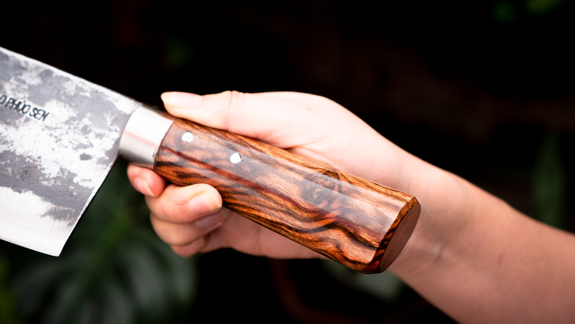 - Cán dao được làm từ gỗ cẩm, mang lại cảm giác chắc chắn, bền bỉ, hạn chế cong vênh, nứt gãy khi sử dụng lâu dài.