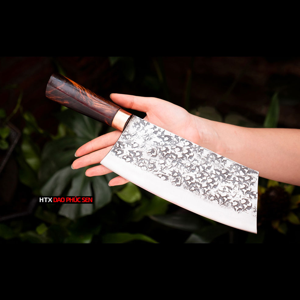 Phần cán dao thiết kế hình độc đáo, được chế tác thủ công tỉ mỉ từ gỗ tự nhiên, cho cảm giác ôm tay, chắc chắn và thoải mái khi sử dụng lâu dài. Đặc biệt, khâu đồng đỏ truyền thống không chỉ tăng độ bền mà còn tạo điểm nhấn thẩm mỹ, mang đến nét đẹp hiện đại pha lẫn tinh hoa thủ công truyền thống.