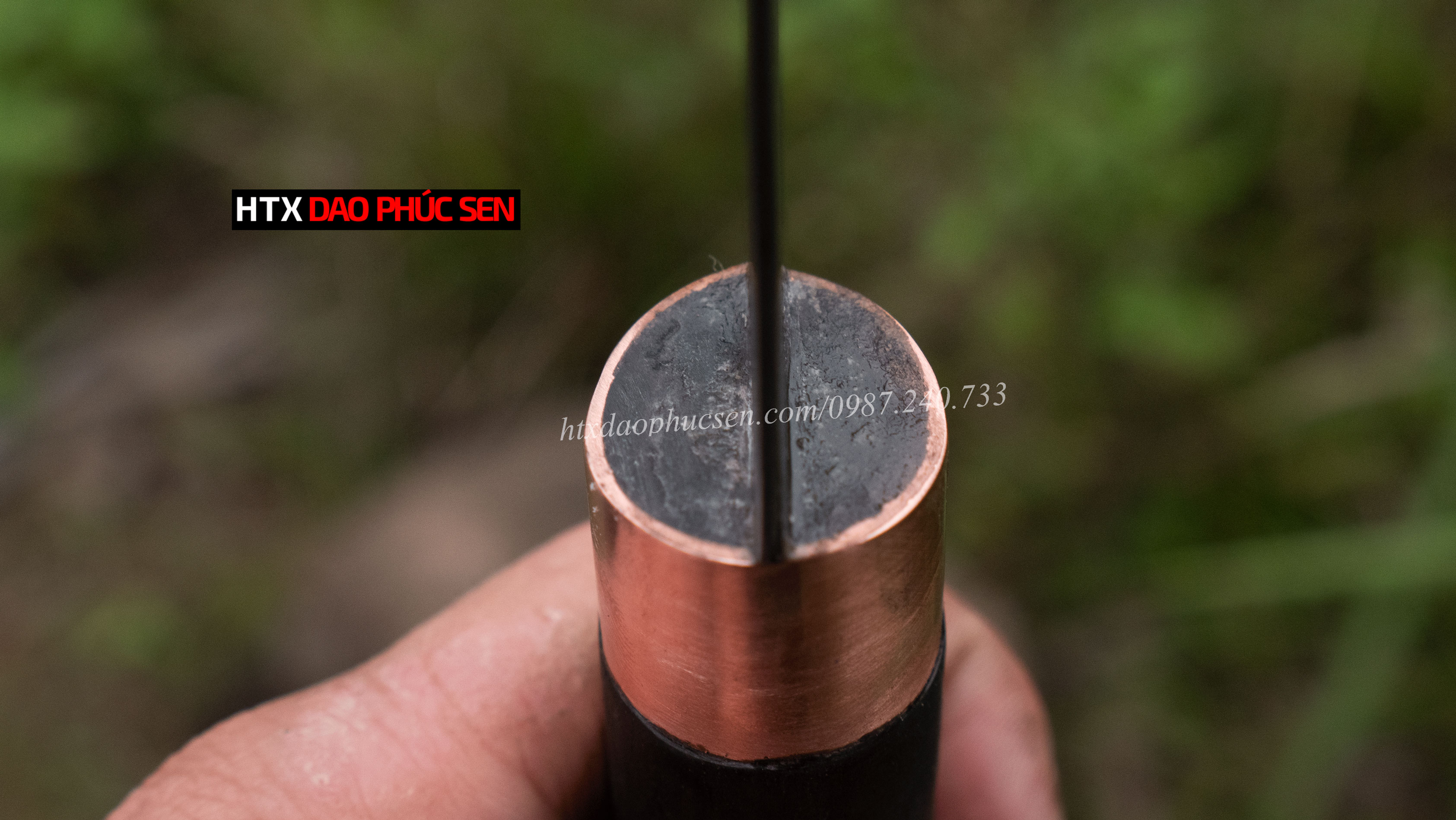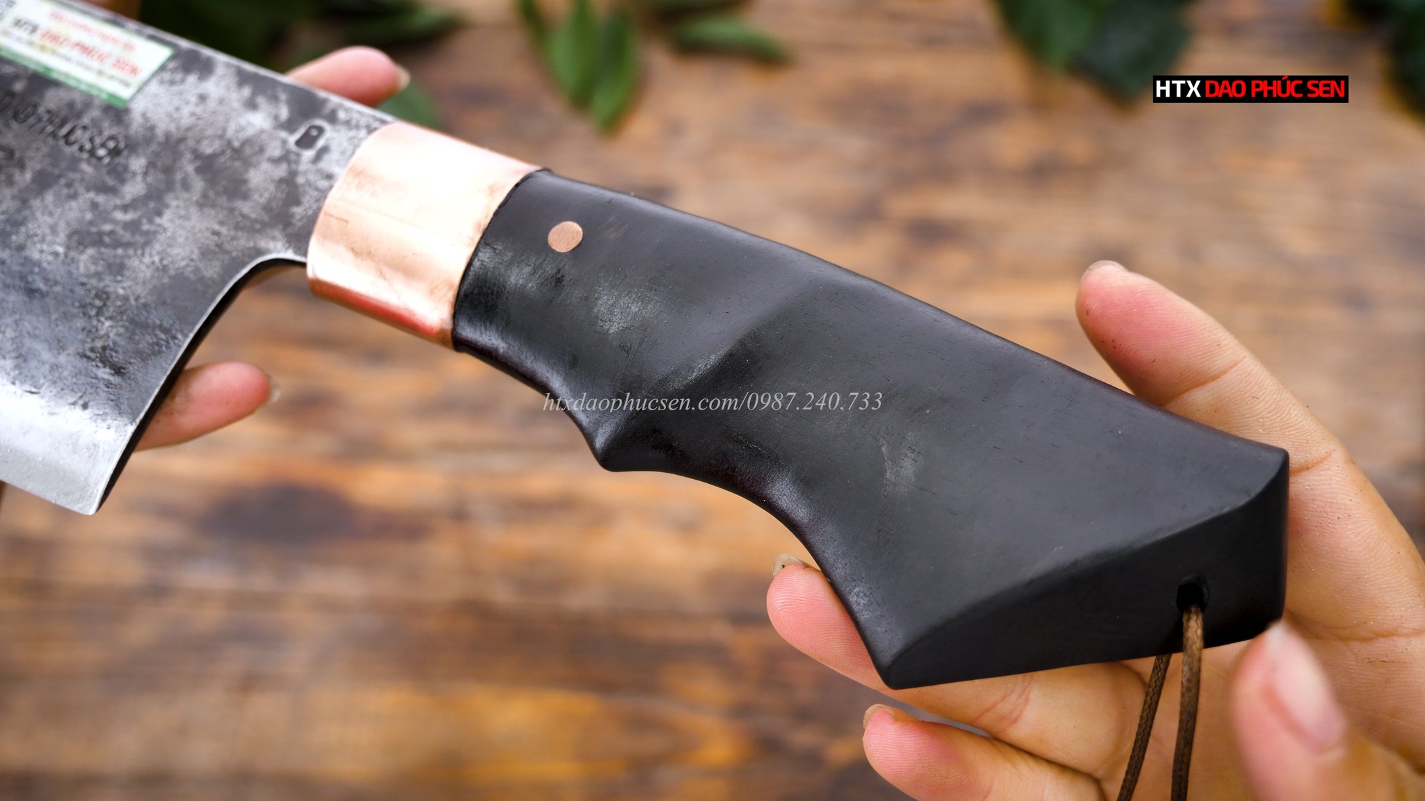 3. Phần cán Dao chặt gà CG04T được làm từ gỗ mun là loại gỗ thường được sử dụng trong sản xuất đồ mỹ nghệ. Bên cạnh tính thẩm mỹ thì độ dai bền của gỗ mun là yếu tố hàng đầu để Dao Vip - Htx Dao Phúc Sen lựa chọn nguyên liệu làm cán dao. Do đặc thù dao bếp khi sử dụng phải thường xuyên tiếp xúc nước nên với ưu điểm hạn chế mủn, mục khi gặp nước như các loại gỗ thông thường, cộng với sự tỉ mỉ, cẩn thận của thợ trong công đoạn tra cán nên dao cán gỗ mun đảm bảo độ bền và an toàn tuyệt đối cho người sử dụng.