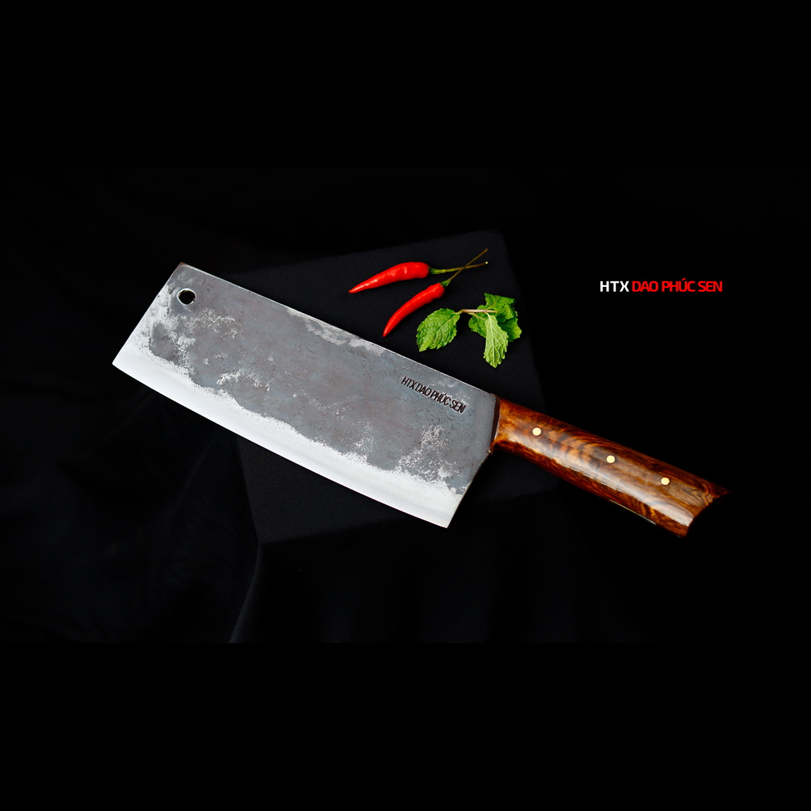 Dao phúc sen chặt gà cán ốp nu nghiến là một sản phẩm của hợp tác xã Dao Phúc Sen. với chiều dài tổng thể của dao là 36.5 cm, bề rộng 9 cm, độ dầy khoảng 2 mm, cùng với cân nặng 500g, với trọng lượng khá đầm và chắc tay, thiết kế gọn gàng, tỉ mỉ sản phẩm rất thích hợp và chuyên được sử dụng để chặt gà, vịt, gia cầm, ngoài ra còn dùng để thái thịt, rau củ quả....Lưỡi dao sắc bén nên cho vết chặt rất đẹp, ngọt, mượt mà, dứt khoát và vuông vắn, đạt thẩm mỹ cao. ngoài ra phần lưỡi được rèn bởi tay nghề của thợ rèn giỏi nên rất sáng bóng và sắc bén theo thời gian.