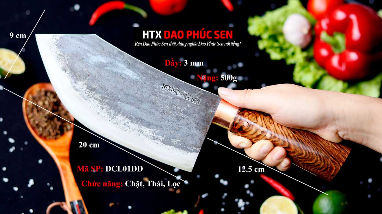 - Dao Phúc Sen chặt lọc DCL01DD với chiều dài tổng thể của dao là 32.5 cm, bề rộng 9 cm, độ dầy khoảng 3 mm, cùng với cân nặng 500g, với trọng lượng vừa phải khoảng 500g nên rất đầm tay, vừa phải, đạp ứng tốt các nhu cầu chặt gà, vịt, cũng như nhẹ nhàng, phù hợp các nhu cầu thái, cắt, và lọc....Với thiết kế gọn gàng sản phẩm rất thích hợp và được sử dụng để thái rau, thịt....cho vết cắt đẹp, ngọt, mượt mà và vuông vắn, đạt thẩm mỹ cao. ngoài ra phần lưỡi được rèn và thiết kế có mũi nhọn nên còn được sử dụng tốt một số chức năng thái khác như lọc, róc thịt, cá, cắt tỉa rau củ quả.