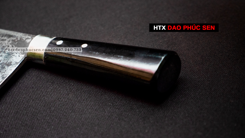 Phần cán Dao Chặt xương cán mun - G06M được làm từ gỗ mun là loại gỗ thường được sử dụng trong sản xuất đồ mỹ nghệ. Bên cạnh tính thẩm mỹ thì độ bền của mun là yếu tố hàng đầu để HTX Dao Phúc Sen lựa chọn là nguyên liệu làm cán dao. Do đặc thù dao bếp khi sử dụng phải thường xuyên tiếp xúc nước nên với ưu điểm không mục, không mủn khi gặp nước như các loại gỗ thông thường, cộng với sự tỉ mỉ, cẩn thận của thợ trong công đoạn tra cán nên dao cán gỗ mun đảm bảo độ bền và an toàn tuyệt đối cho người sử dụng.