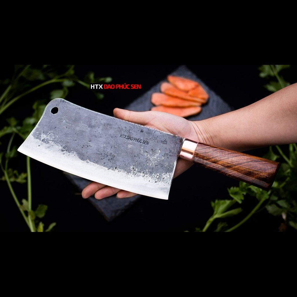 Phần cán dao làm từ gỗ cẩm tự nhiên, dược khâu đồng đỏ chắc chắn, không chỉ tạo cảm giác đầm tay, êm ái khi sử dụng mà còn tăng độ bền, chống bung nứt trong quá trình thao tác mạnh. Toàn bộ dao được rèn kỹ, tỉ mỉ, cẩn thận chuẩn truyền thống của Hàng chuẩn dao vip - HTX Dao Phúc Sen đảm bảo độ bén lâu dài, ít phải mài lại, dùng bền theo năm tháng.