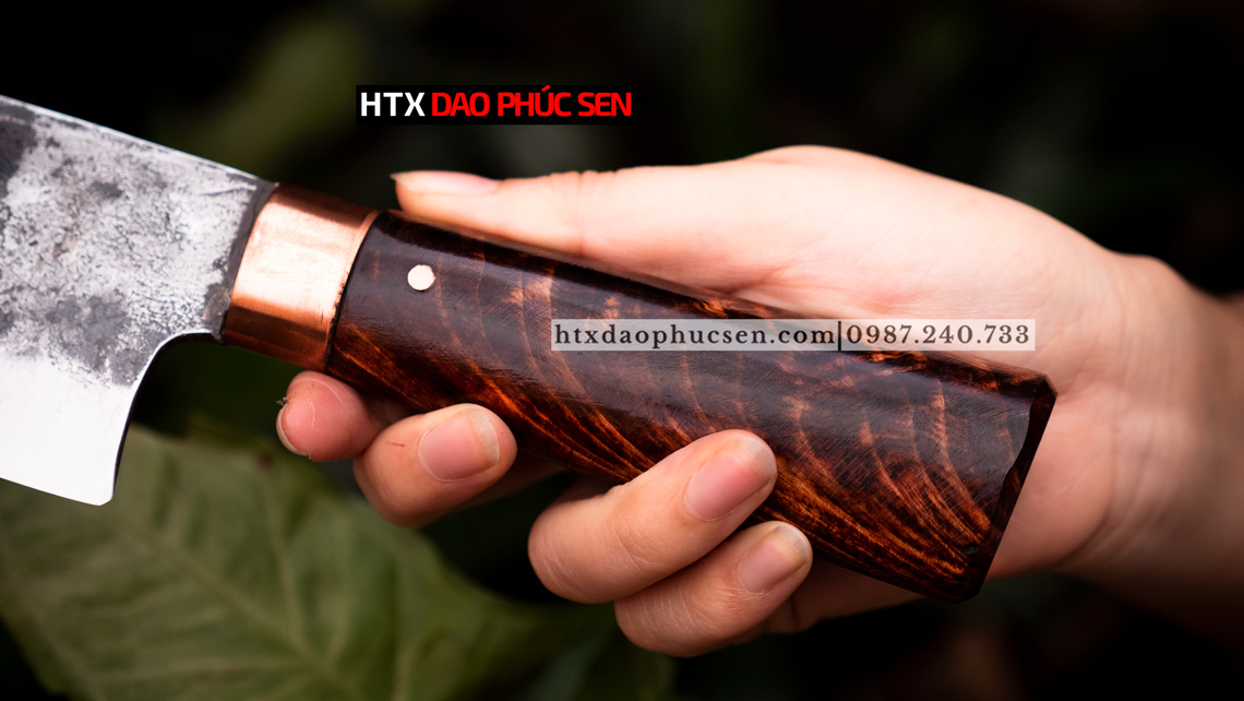 Phần cán Dao Deba chống dính - N12TDD được làm từ gỗ cẩm chỉ là loại gỗ thường được sử dụng trong sản xuất đồ mỹ nghệ. Bên cạnh tính thẩm mỹ thì độ dai bền của gỗ cẩm chỉ là yếu tố hàng đầu để HTX Dao Phúc Sen lựa chọn là nguyên liệu làm cán dao. Do đặc thù dao bếp khi sử dụng phải thường xuyên tiếp xúc nước nên với ưu điểm không mục, không mủn khi gặp nước như các loại gỗ thông thường, cộng với sự tỉ mỉ, cẩn thận của thợ trong công đoạn tra cán nên dao cán gỗ cẩm chỉ đảm bảo độ bền và an toàn tuyệt đối cho người sử dụng.