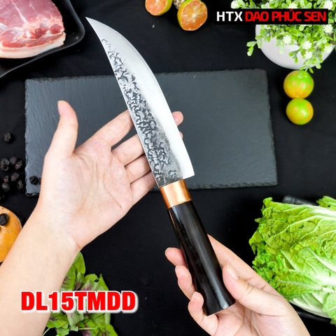 Dao lọc 15 cán mun chống dính - DL15TTMDD Lựa chọn nguyên liệu 100% là nhíp ô tô ( Liên xô, Ifa ) được gia công tỉ mỉ từ lưỡi dao cho đến cán dao đảm bảo việc thái lọc sắc - ngọt. Các sản phẩm của HTX Dao Phúc Sen đều sử dụng than củi khi nung thép cũng như tôi dao để đảm bảo lưỡi dao khi ra lò sắc bén và bền lâu. Nét đặc biệt của mẫu dao này là bề mặt lưỡi dao được thợ rèn giỏi của HTX Dao Phúc Sen đập rèn hoa văn tỉ mỉ đẹp mắt tạo nét khác biệt cho từng con dao và bề mặt hoa văn này còn có tác dụng chống dính bám thực phẩm khi cắt, thái.