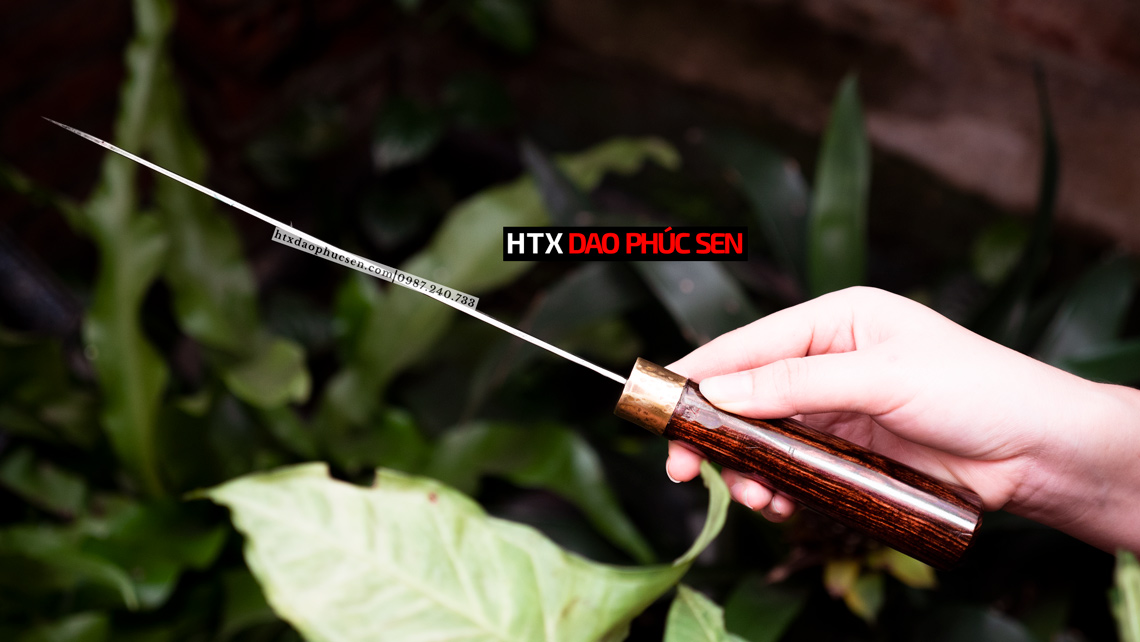 Phần cán Dao lọc cao cấp - DLD được làm từ gỗ cẩm chỉ là loại gỗ thường được sử dụng trong sản xuất đồ mỹ nghệ. Bên cạnh tính thẩm mỹ thì độ dai bền của gỗ cẩm chỉ là yếu tố hàng đầu để HTX Dao Phúc Sen lựa chọn là nguyên liệu làm cán dao. Do đặc thù dao bếp khi sử dụng phải thường xuyên tiếp xúc nước nên với ưu điểm không mục, không mủn khi gặp nước như các loại gỗ thông thường, cộng với sự tỉ mỉ, cẩn thận của thợ trong công đoạn tra cán nên dao cán gỗ cẩm chỉ đảm bảo độ bền và an toàn tuyệt đối cho người sử dụng.