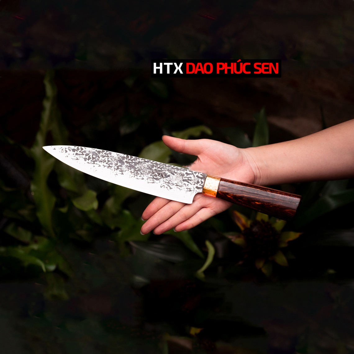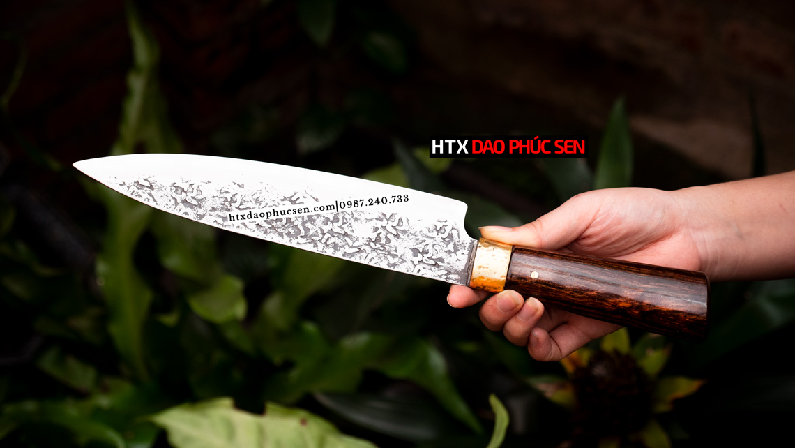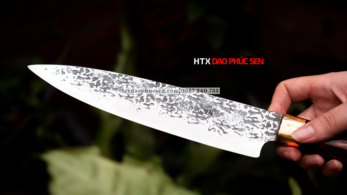 Dao lọc cao cấp - DLD Lựa chọn nguyên liệu 100% là nhíp ô tô ( Liên xô, Ifa ) được các thợ rèn giỏi gia công tỉ mỉ từ lưỡi dao cho đến cán dao đảm bảo việc thái lọc sắc - ngọt. Các sản phẩm của HTX Dao Phúc Sen thợ rèn đều sử dụng than củi khi nung thép cũng như tôi dao để đảm bảo lưỡi dao khi ra lò sắc bén và bền lâu. Nét đặc biệt của mẫu dao này là bề mặt lưỡi dao được thợ rèn giỏi của HTX Dao Phúc Sen đập rèn hoa văn tỉ mỉ đẹp mắt tạo nét khác biệt cho từng con dao và bề mặt hoa văn này còn có tác dụng chống dính bám thực phẩm khi cắt, thái.