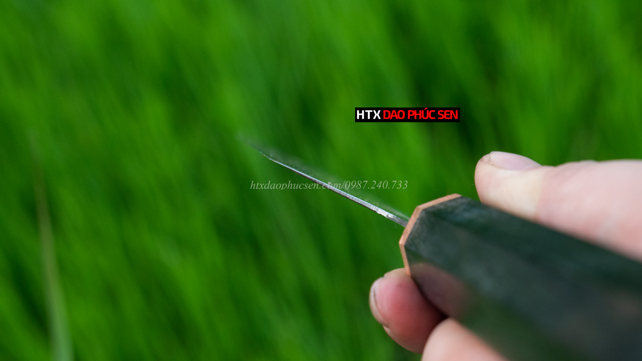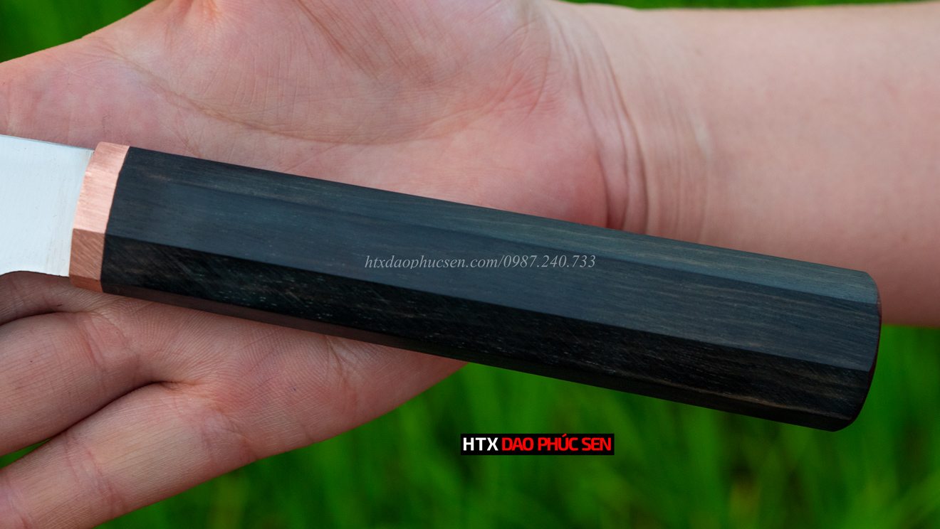 Ngoài ra phần cán được thiết kế hình bát giác cán làm cho việc cầm nắm chắc chắn và êm tay . Khâu đồng liên kết giữa cán với lưỡi dao bền đẹp.