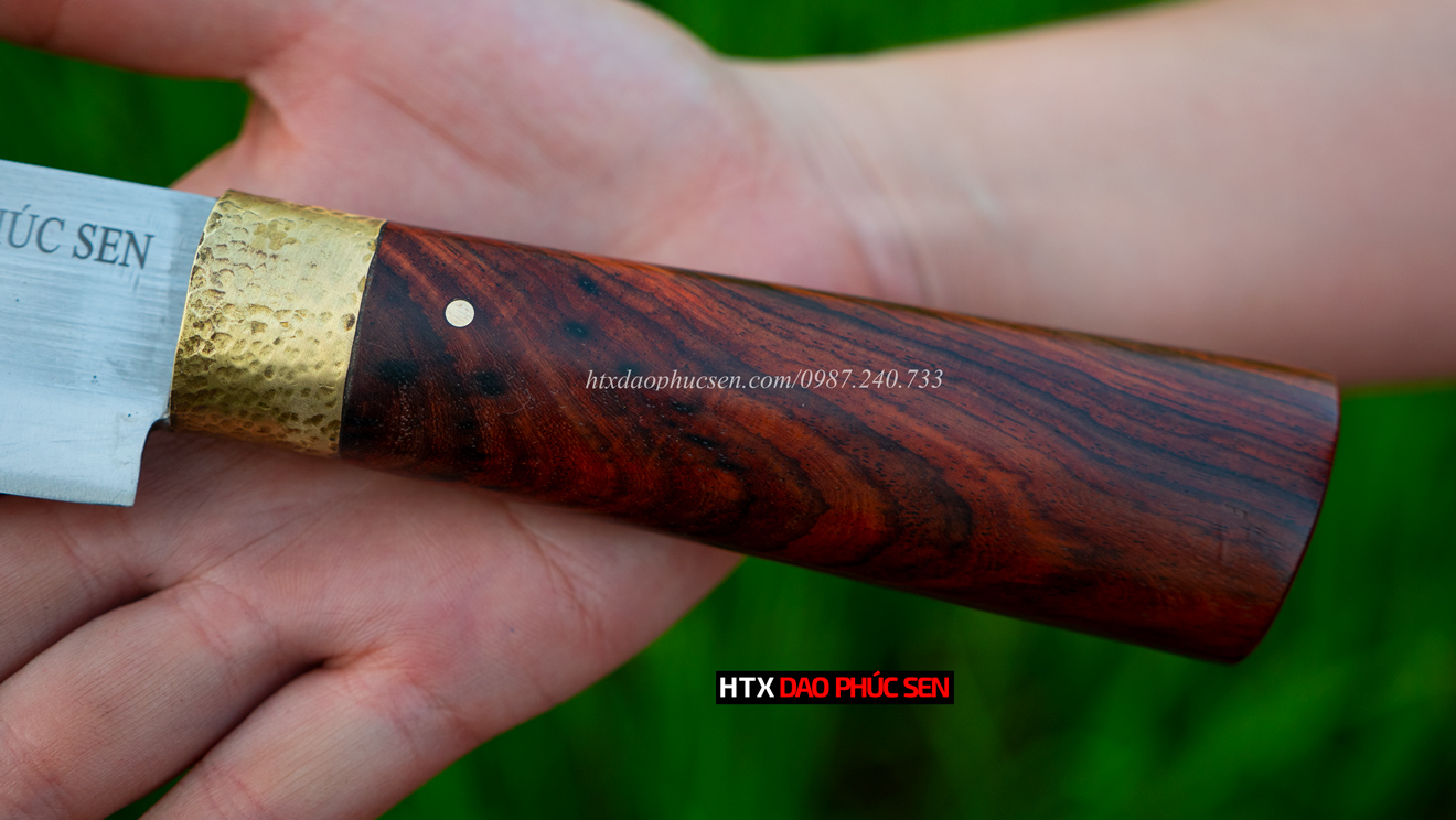 Sản phẩm được rèn thủ công từ thép trắng – dòng thép có độ đàn hồi cao, giữ sắc tốt và rất bền, đặc biệt với khả năng kháng rỉ cao. Cán dao được tiện từ gỗ tự nhiên chắc chắn, cán gỗ với khâu đồng vàng gò text chắc chắn, đẹp mắt, hạn chế bung lưỡi. Cán được thiết kế thuôn theo tay nên cầm chắc tay, an toàn sử dụng, chống trơn trượt.