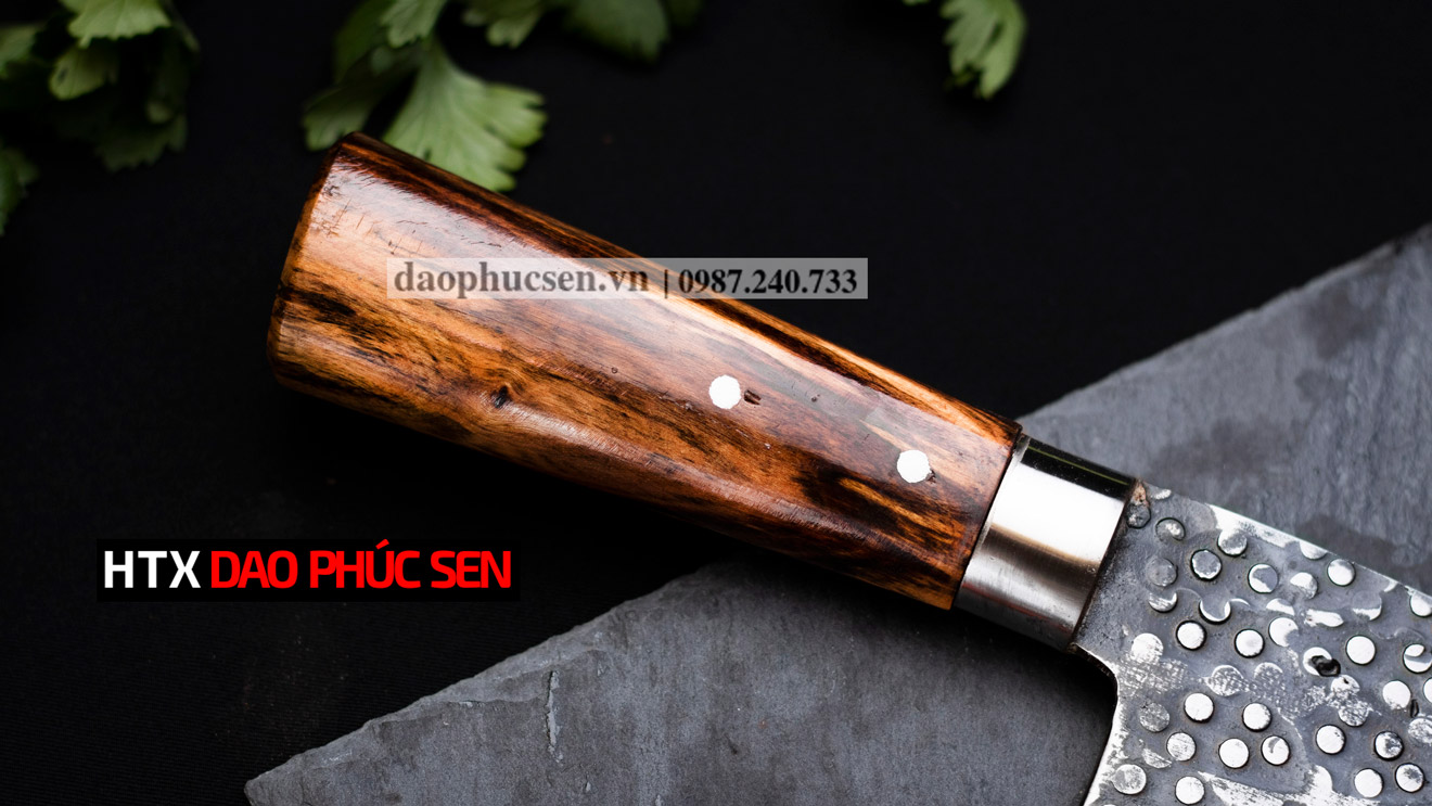Phần chuôi của sản phẩm Dao pha luông ( Serbian Cleaver ) - DPL được gia công tỉ mỉ bằng gỗ cẩm chỉ rừng vừa tạo nên vẻ đẹp của vân gỗ rừng cẩm chỉ tự nhiên được bó chặt bằng chụp inox 302 chịu lực cũng như luôn sáng bóng trước những thay đổi của môi trường, đặc biệt không bị rỉ hay yếu và dễ gãy cũng như bị oxy hóa . vừa đảm bảo độ bền đẹp cũng như mức độ thẩm mỹ của dao phúc sen vốn tốt và bền đẹp.