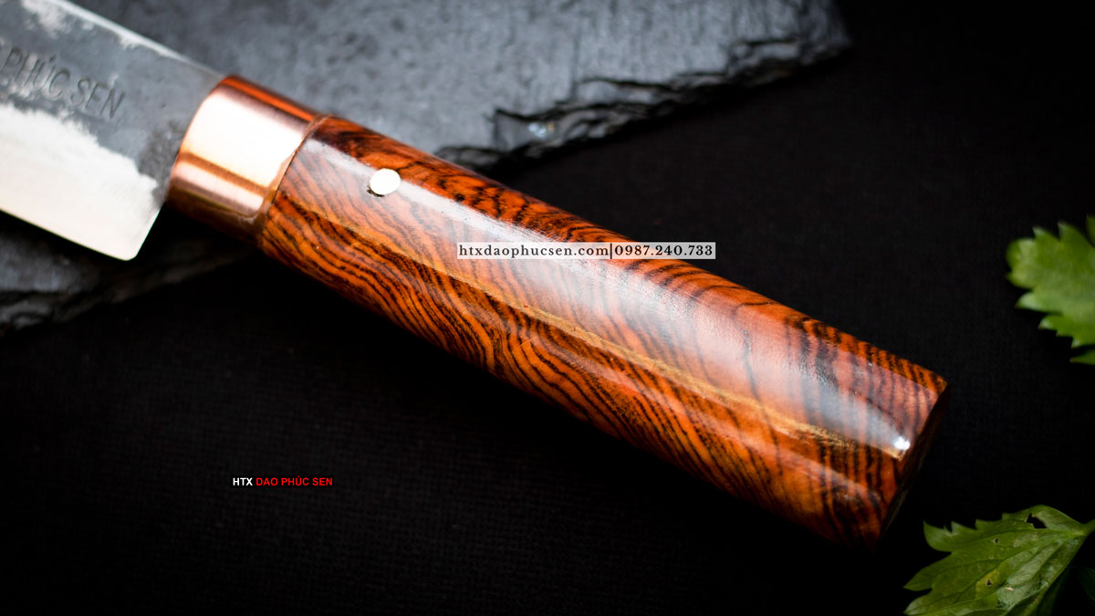 Phần cán Dao thái lọc Takohiki N15DD được làm từ gỗ cẩm chỉ là loại gỗ thường được sử dụng trong sản xuất đồ mỹ nghệ. Bên cạnh tính thẩm mỹ thì độ bền của cẩm chỉ là yếu tố hàng đầu để Dao Vip - Htx Dao Phúc Sen lựa chọn là nguyên liệu làm cán dao. Do đặc thù dao bếp khi sử dụng phải thường xuyên tiếp xúc nước nên với ưu điểm hạn chế mục, mủn khi gặp nước như các loại gỗ thông thường, cộng với sự tỉ mỉ, cẩn thận của thợ trong công đoạn tra cán nên dao cán gỗ cẩm chỉ đảm bảo độ bền và an toàn tuyệt đối cho người sử dụng.