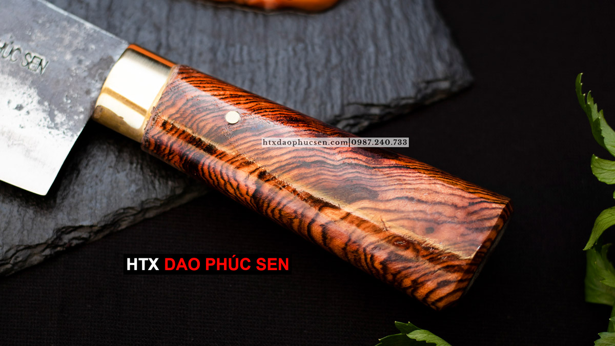Phần cán Dao thái 20 cán cẩm khâu đồng được làm từ gỗ cẩm chỉ là loại gỗ thường được sử dụng trong sản xuất đồ mỹ nghệ. Bên cạnh tính thẩm mỹ thì độ bền của gỗ cẩm chỉ là yếu tố hàng đầu để HTX Dao Phúc Sen lựa chọn là nguyên liệu làm cán dao. Do đặc thù dao bếp khi sử dụng phải thường xuyên tiếp xúc nước nên với ưu điểm không mục, không mủn khi gặp nước như các loại gỗ thông thường, cộng với sự tỉ mỉ, cẩn thận của thợ trong công đoạn tra cán nên dao cán gỗ cẩm chỉ đảm bảo độ bền và an toàn tuyệt đối cho người sử dụng.