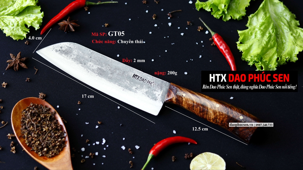 Dao Phúc Sen thái kiểu 05 cán ốp đồng là một sản phẩm của hợp tác xã Dao Phúc Sen. với chiều dài tổng thể của dao là 30 cm, bề rộng 4 cm, độ dầy khoảng 1 mm, cùng với cân nặng 300g, với trọng lượng nhẹ, thiết kế gọn gàng sản phẩm rất thích hợp và được sử dụng để thái rau, thịt....cho vết cắt đẹp, ngọt, mượt mà và vuông vắn, đạt thẩm mỹ cao. ngoài ra phần lưỡi được rèn và thiết kế có mũi hơi nhọn nên còn được sử dụng tốt một số chức năng thái khác như lọc, róc thịt, cá, cắt tỉa rau củ quả.