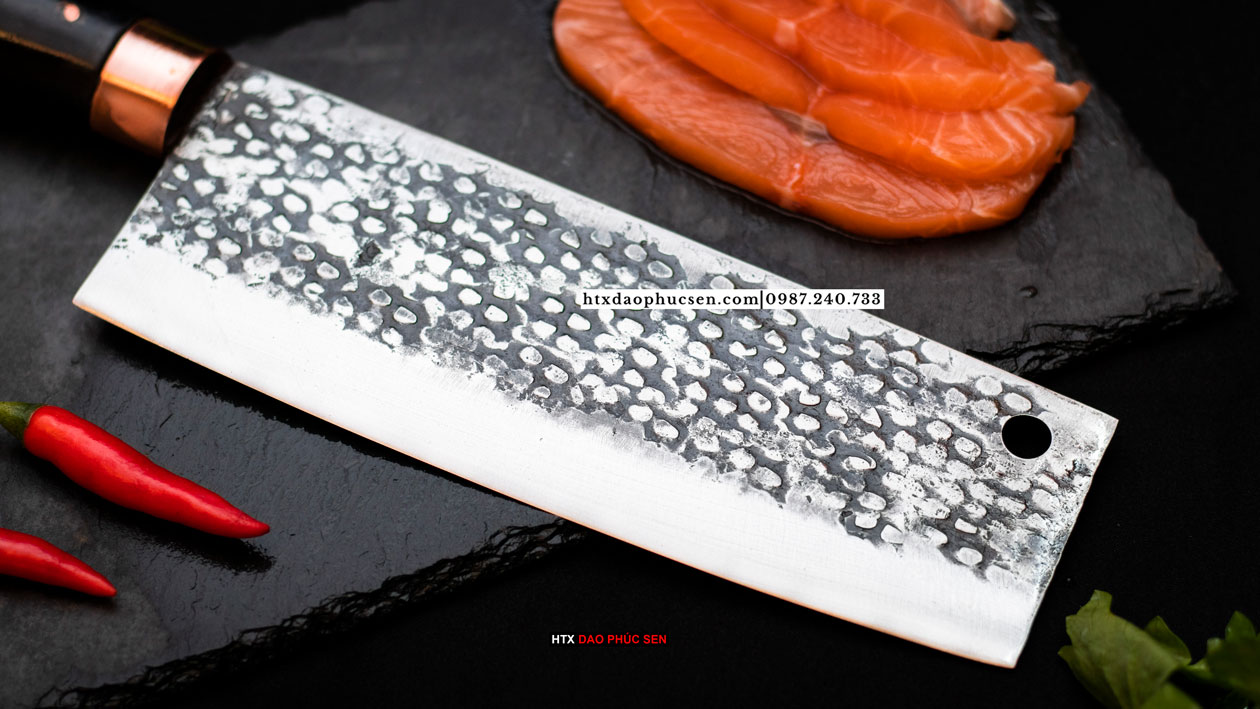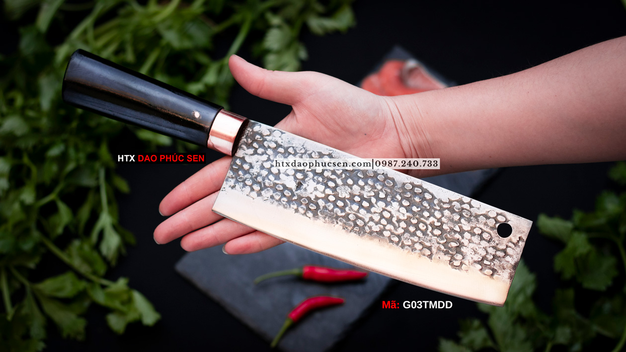 Dao thái 22 chống dính - G03TMDD Lựa chọn nguyên liệu 100% là nhíp ô tô ( Liên xô, Ifa ) được các thợ rèn giỏi gia công tỉ mỉ từ lưỡi dao cho đến cán dao đảm bảo việc thái sắc - ngọt. Bề mặt lưỡi dao được rèn họa tiết hoa văn tạo độ thẩm mỹ tinh tế và có chức năng chống dính thực phẩm khi thái. Các sản phẩm của HTX Dao Phúc Sen thợ rèn đều sử dụng than củi khi nung thép cũng như tôi dao để đảm bảo lưỡi dao khi ra lò sắc bén và bền lâu.
