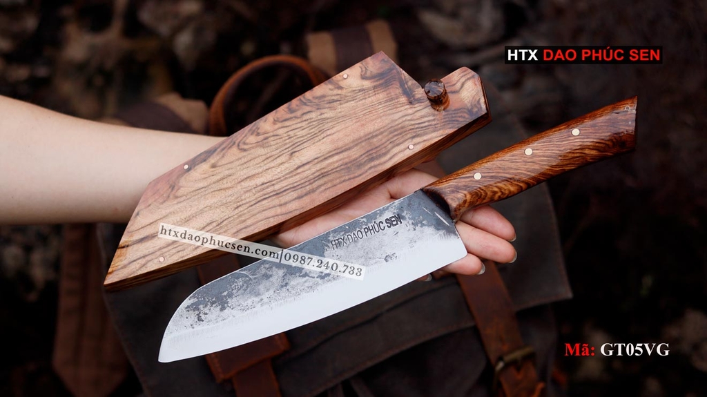Dao thái GT05VG là một sản phẩm của HTX DAO PHÚC SEN. với chiều dài tổng thể của dao là 30 cm, bề rộng 4.5 cm, độ dầy khoảng 1 mm, cùng với cân nặng 300g, với trọng lượng nhẹ, thiết kế gọn gàng sản phẩm rất thích hợp và được sử dụng để thái rau, thịt....cho vết cắt đẹp, ngọt, mượt mà và vuông vắn, đạt thẩm mỹ cao. ngoài ra phần lưỡi được rèn và thiết kế có mũi hơi nhọn nên còn được sử dụng tốt một số chức năng thái khác như lọc, róc thịt, cá, cắt tỉa rau củ quả. ngoài ra Dao thái GT05VG còn có vỏ bảo vệ được gia công rất tỉ mỉ từ gỗ cẩm chỉ tự nhiên, vừa đảm bảo an toàn, vừa bền đẹp, xứng đáng là một sản phẩm cao cấp cho anh chị kỹ tính và thật sự muốn trải nghiệm và yêu quý một con dao phúc sen tốt, Dao Phúc Sen cao cấp.