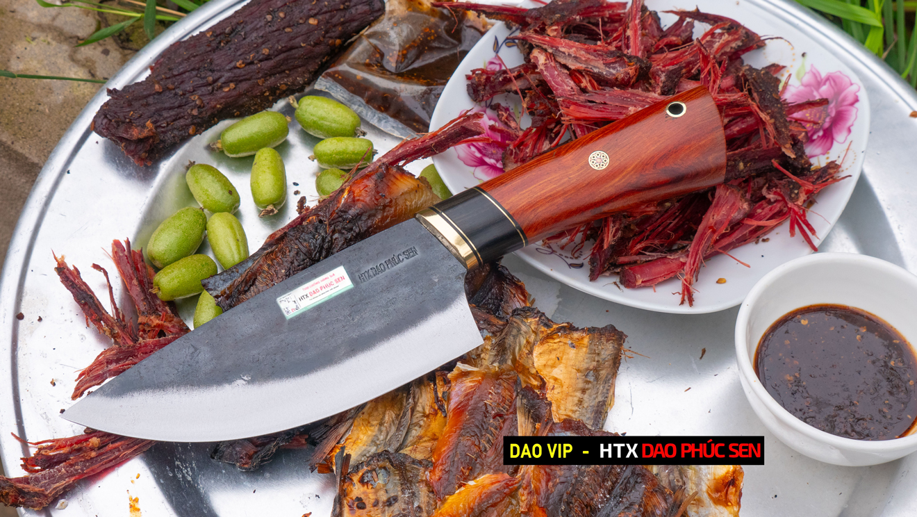 Lưỡi dao được rèn từ thép nhíp xe cao cấp, trải qua quy trình rèn và tôi bằng than củi truyền thống, giúp lưỡi dao sắc bén, cứng cáp, bền lâu và giữ được độ ngọt khi thái. Mỗi chiếc dao đều được thơ rèn DAO VIP - HTX DAO PHÚC SEN làm tỉ mỉ từng chi tiết, đảm bảo chất lượng và hiệu năng sử dụng tối ưu.