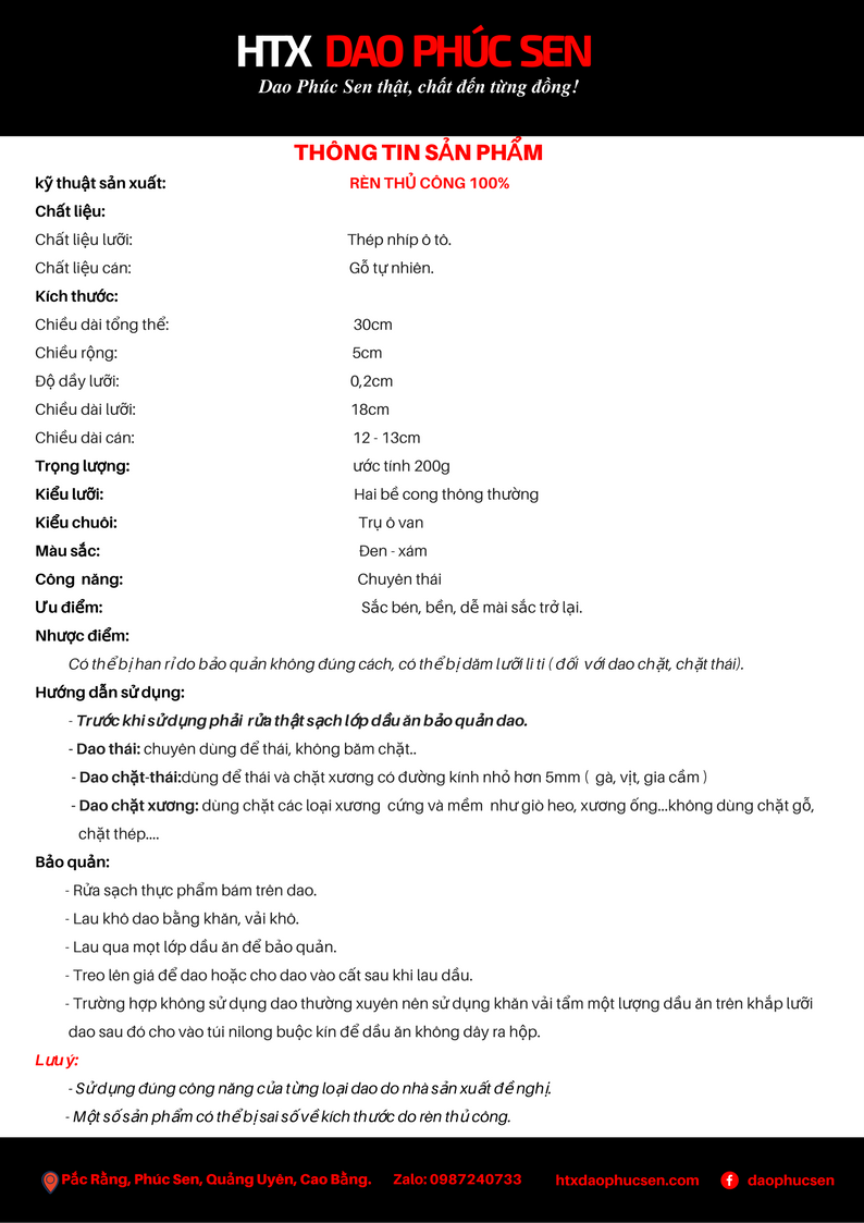 Được chế tác thủ công từ thép nhíp ô tô, lưỡi dao mỏng – sắc – bén lâu, dễ mài lại. Cán gỗ tự nhiên chắc chắn, kết hợp khâu inox hạn chế bung, mang đến cảm giác nhẹ – gọn – an toàn khi sử dụng.