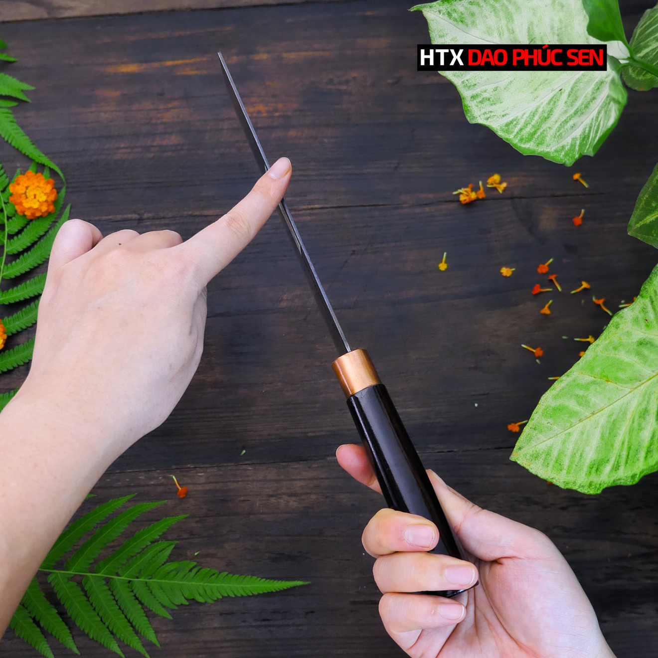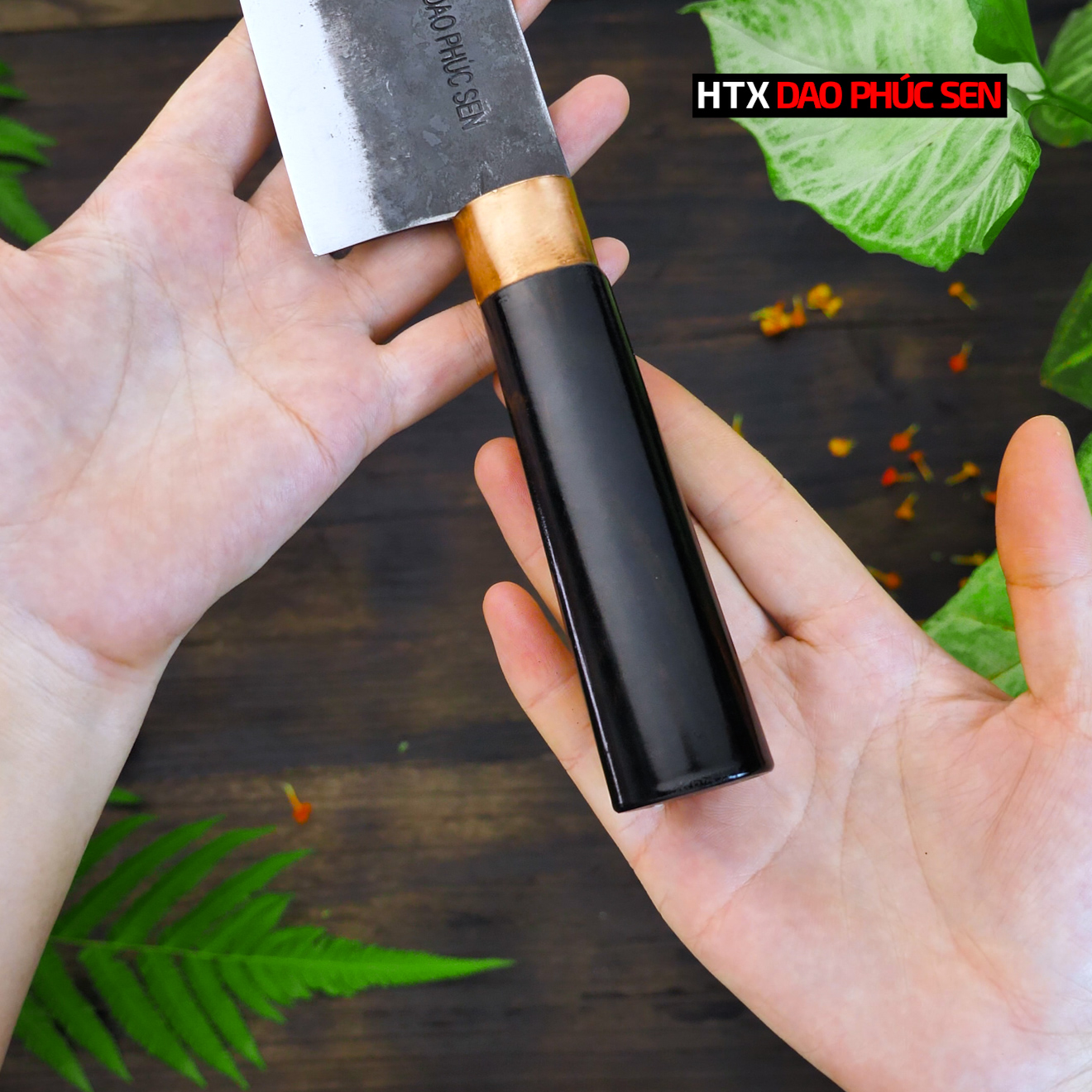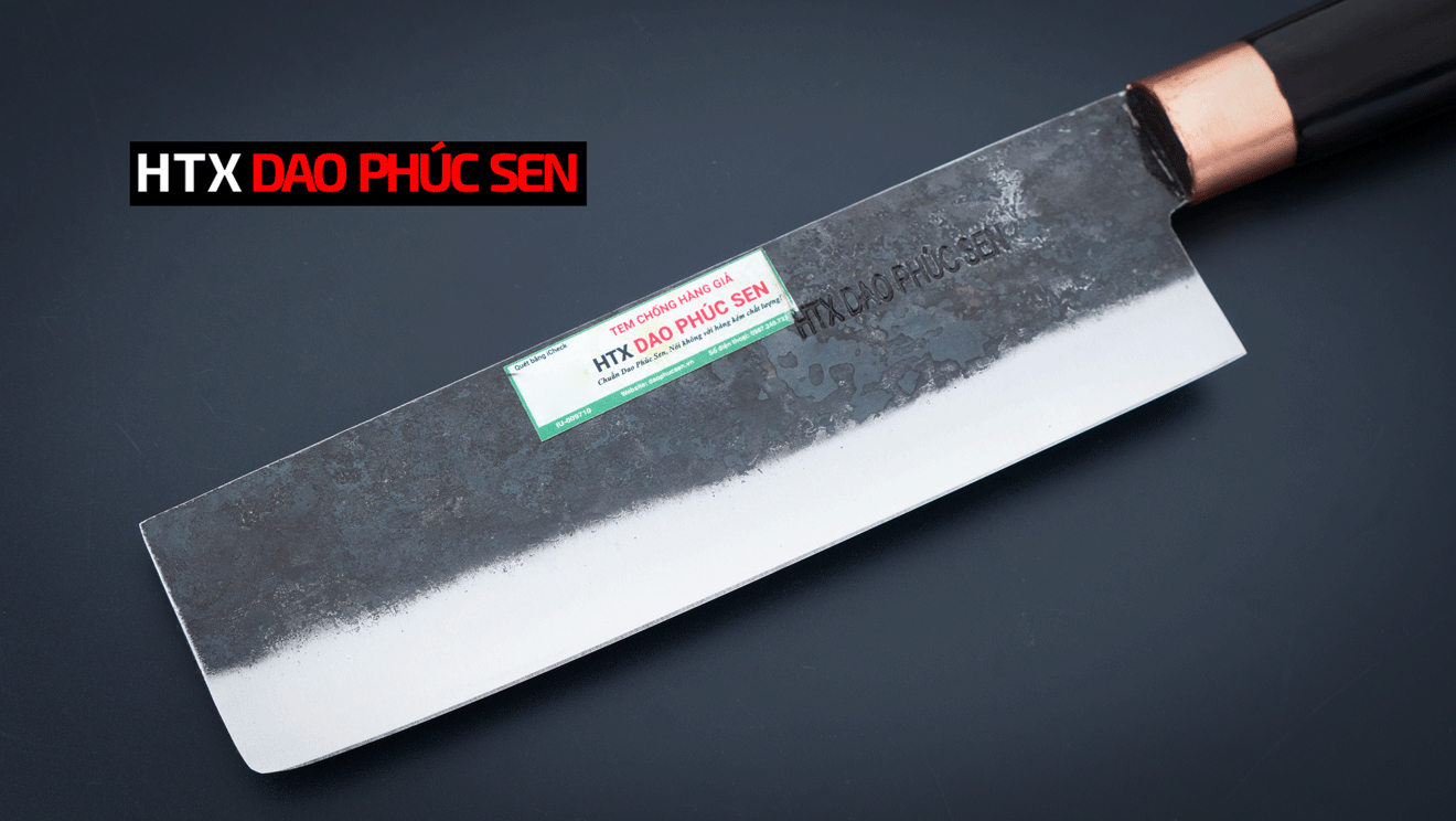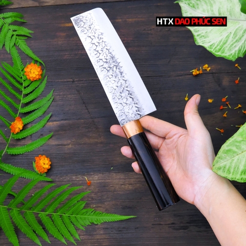 Dao usuba chống dính - N13TMDD Lựa chọn nguyên liệu 100% là nhíp ô tô ( Liên xô, Ifa ) được các thợ rèn giỏi gia công tỉ mỉ từ lưỡi dao cho đến cán dao đảm bảo việc thái lọc sắc - ngọt. Các sản phẩm của HTX Dao Phúc Sen thợ rèn đều sử dụng than củi khi nung thép cũng như tôi dao để đảm bảo lưỡi dao khi ra lò sắc bén và bền lâu. Nét đặc biệt của mẫu dao này là bề mặt lưỡi dao được thợ rèn giỏi của HTX Dao Phúc Sen đập rèn hoa văn tỉ mỉ đẹp mắt tạo nét khác biệt cho từng con dao và bề mặt hoa văn này còn có tác dụng chống dính bám thực phẩm khi cắt, thái.